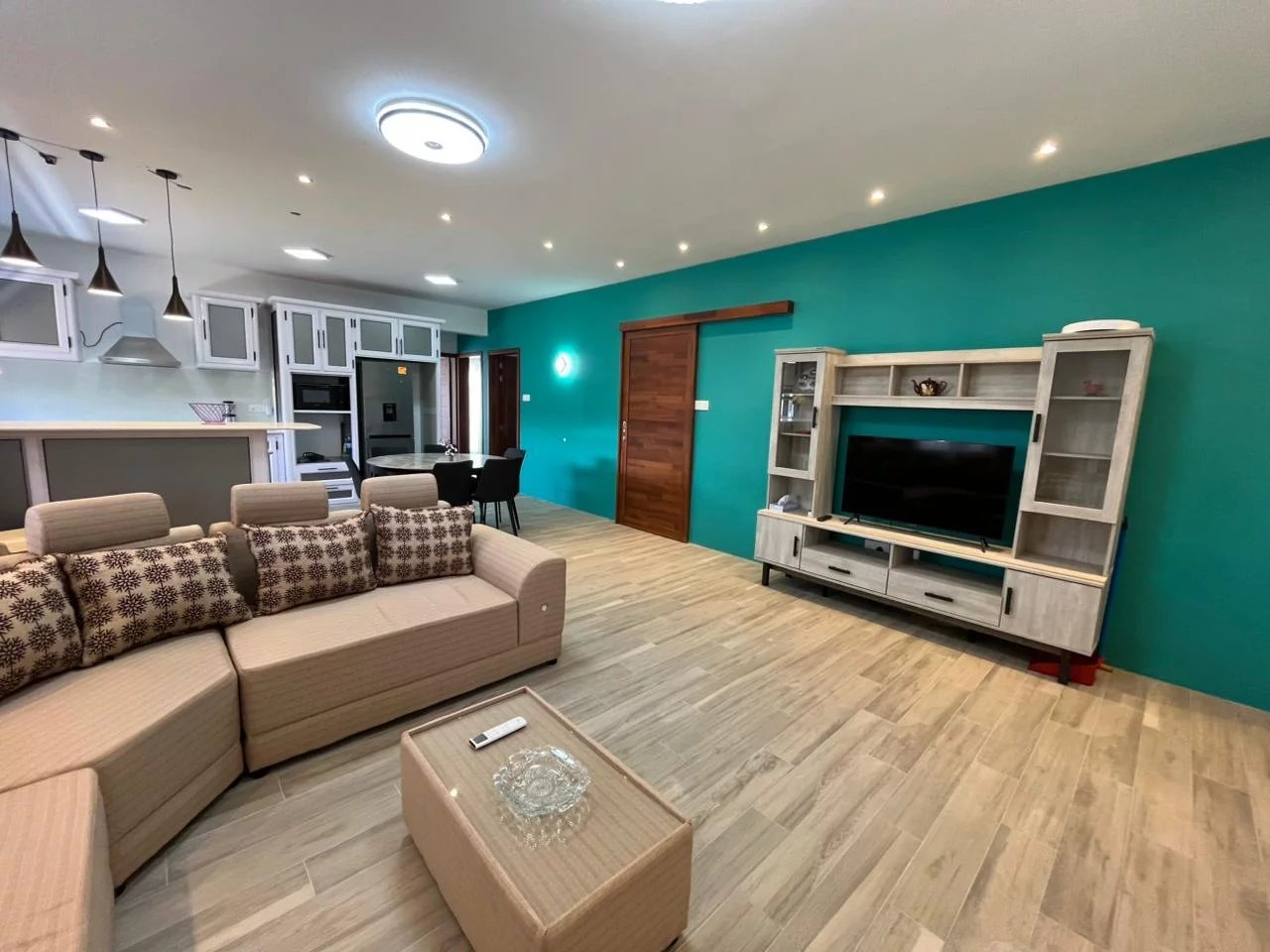 The apartment comprises three spacious bedrooms. The inviting living room provides a perfect space to relax and share moments with family.