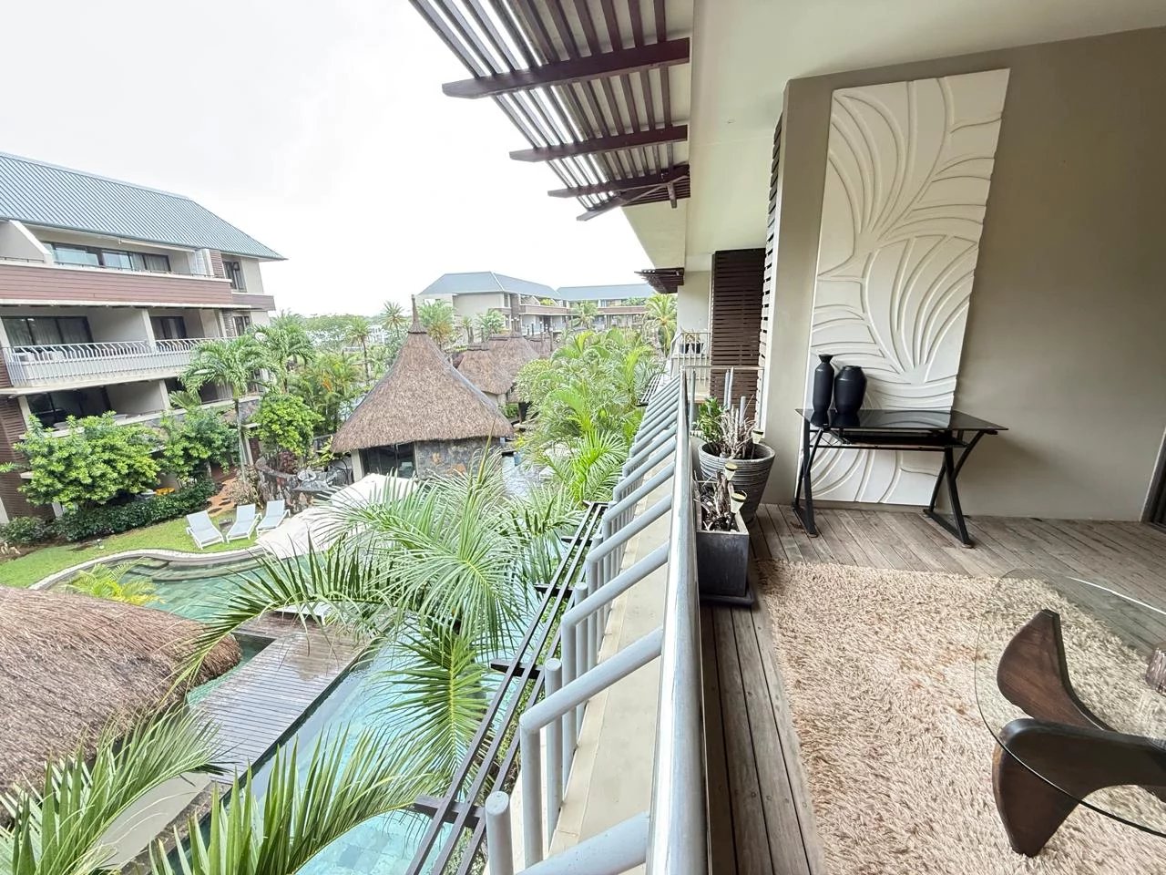 The comfortable and well-designed living area opens onto a large balcony, a real highlight of the property. This spacious balcony offers a beautiful unobstructed view of the swimming pool and the estate, allowing you to fully enjoy the fresh air, moments of relaxation or al fresco dining.