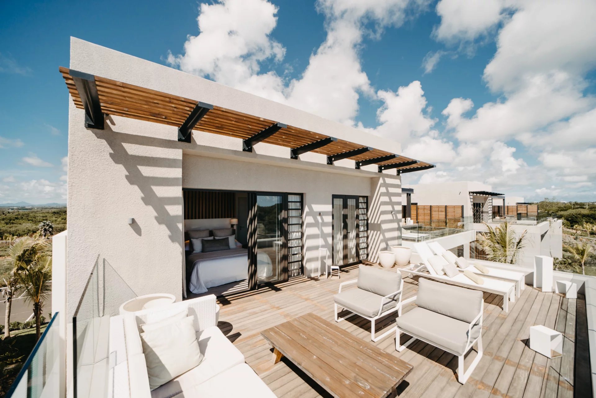 The sleeping areas are tastefully decorated, with luxury bedding ensuring optimal comfort. The penthouse has a private plunge pool, offering an exclusive space to relax in complete privacy. The residence is surrounded by lush, perfectly maintained gardens and offers two communal swimming pools, a secure play area for children, and a clubhouse dedicated to relaxation and socializing. Parking spaces are also available.