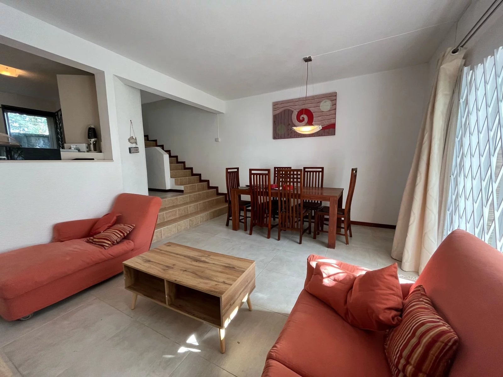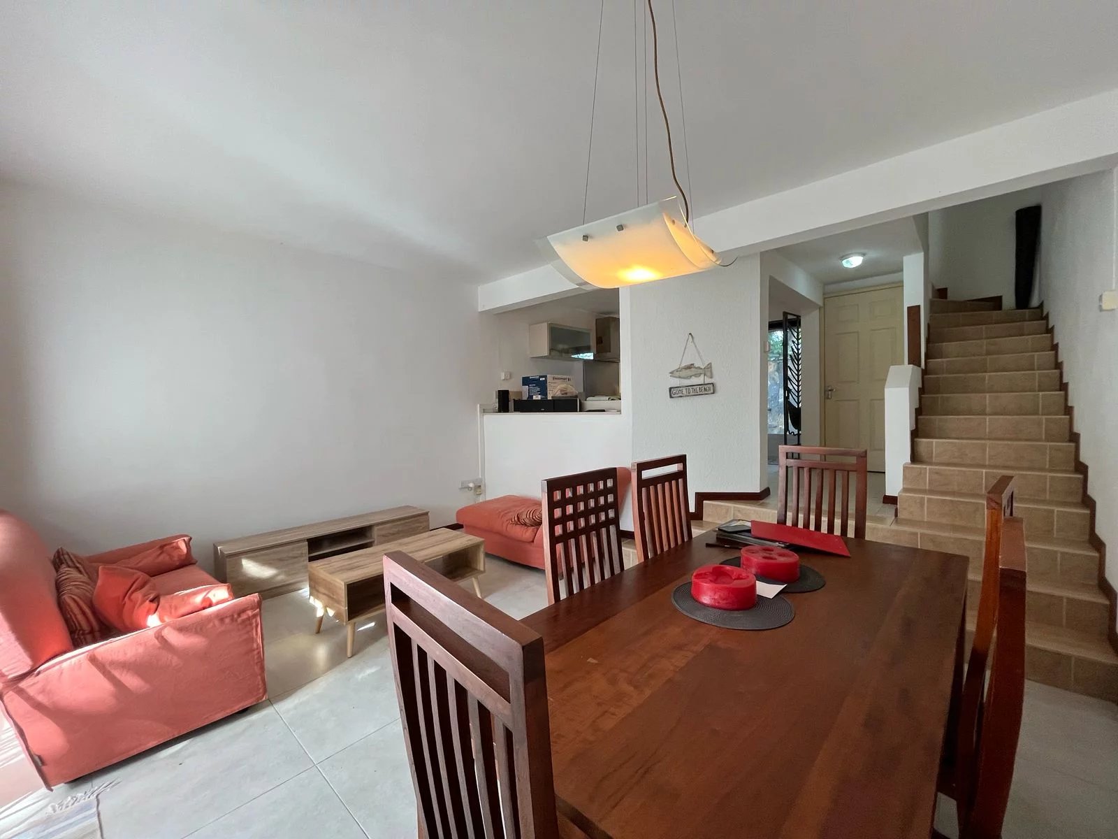 The ground floor features a fully equipped kitchen that opens onto a bright living room and dining area, along with a guest toilet.