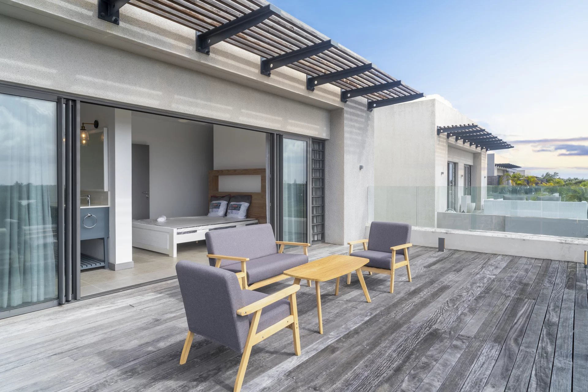 With a total surface area of 2,680 sq ft, the penthouse opens onto a spacious, bright living room, designed to offer a friendly and refined atmosphere. The large windows allow you to fully enjoy breathtaking panoramic views of the sea and lush gardens, creating a feeling of space and serenity. The warm kitchen, designed to combine functionality and aesthetics, blends harmoniously into the living space, ideal for everyday use and entertaining.