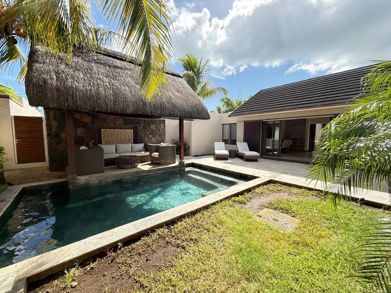 The property also features a fenced courtyard with a garden and a gazebo. 24-hour security and access to the private Trou aux Biches Beach Club.