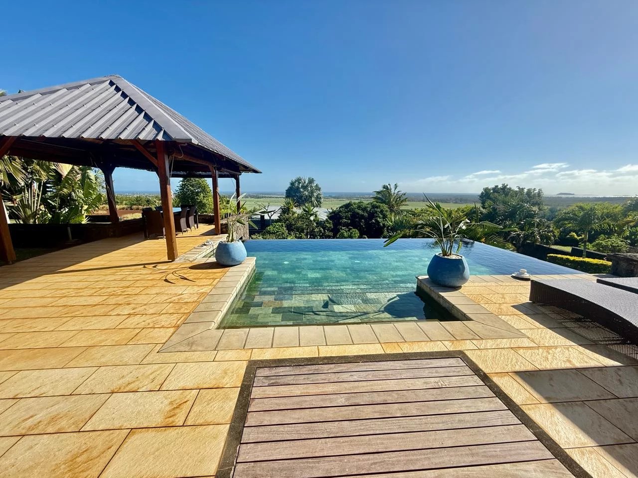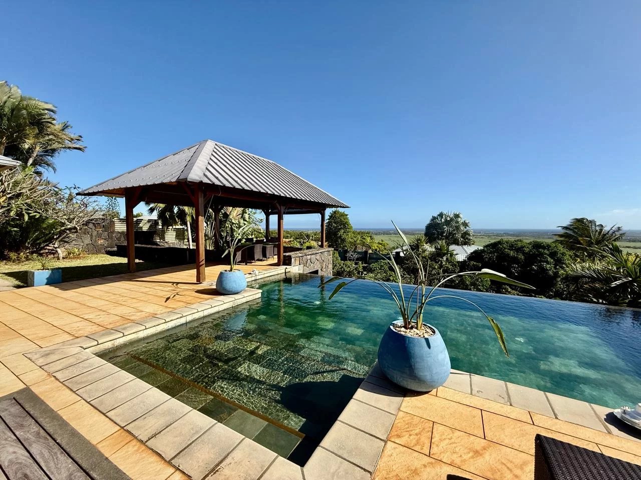 Le séjour et la salle à manger s’ouvrent sur un grand jardin avec kiosque, idéal pour se détendre ou recevoir.