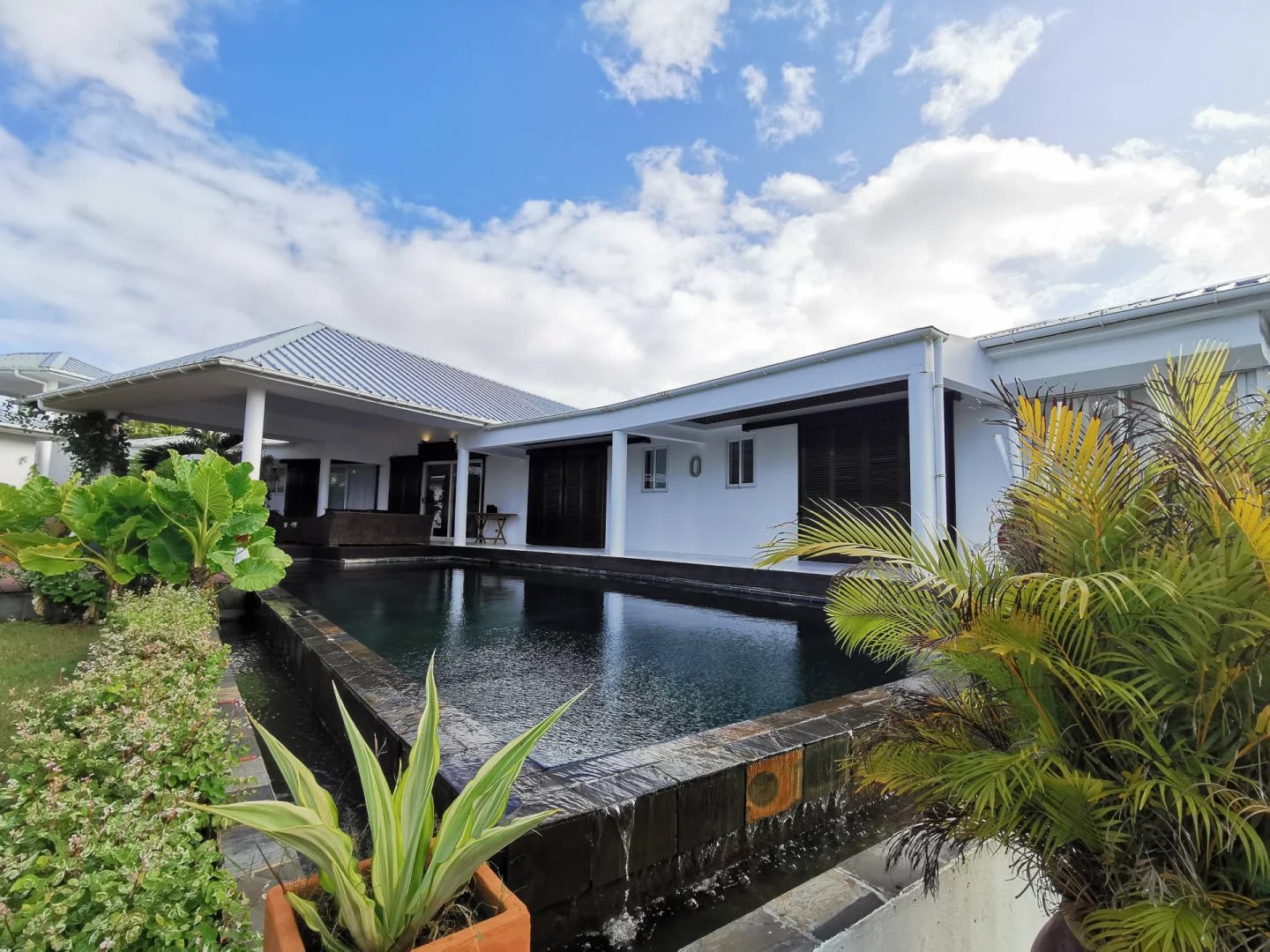 L'extérieur vous offre une veranda avec vue imprenable sur les iles du Nord, un joli jardin aux arbres tropicaux, une sublime piscine en ardoise et sécurisée 24hr/24.