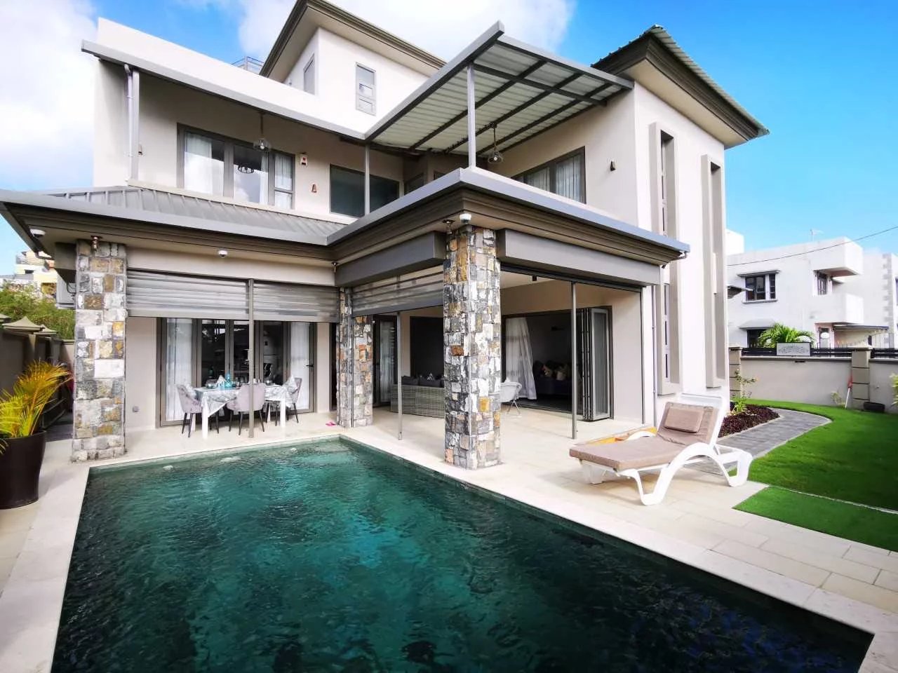 Décorée avec beaucoup de goût elle vous offre un séjour lumineux, une salle à manger, une cuisine moderne et tout équipée, quatre chambres à coucher climatisées dont une en suite avec une baignoire, deux autres salles de bain ainsi qu'une buanderie.